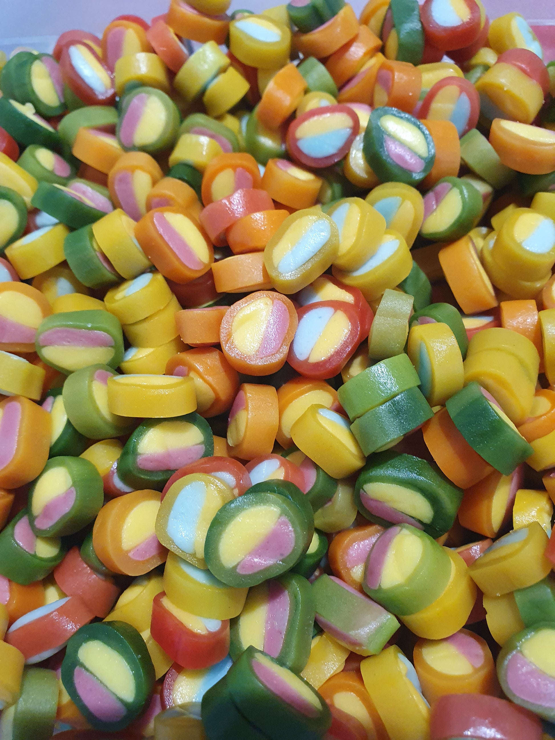 Sucre, farine de blé, sirop de glucose - fructose, amidon de blé, graisse végétale, dextrose, émulsifiant, mono et di-glycérides d’acides gras, concentrés de fruits et de plantes (radis, cassis, pomme, baie de sureau, aronie, raisin, spiruline), extraits de fruits et de plantes (baie de sureau), gélatine, acidifiant : acide citrique, arômes, colorants : curcumine, complexes cuivre-chlorophylles et chlorophyllines, agents d’enrobage : cire d’abeilles, cire de carnauba.